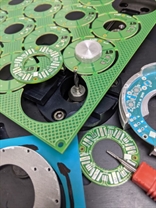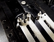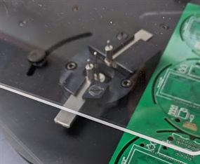 The standard tooling for the R100 is a round disk with guide pins. These can be adjusted for singulating straight or round panels by rotating the front guide pin on the disk to align straight or along a radious for round panels.