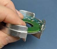The standard tooling for the R100 is a round disk with guide pins. These can be adjusted for singulating straight or round panels by rotating the front guide pin on the disk to align straight or along a radious for round panels.